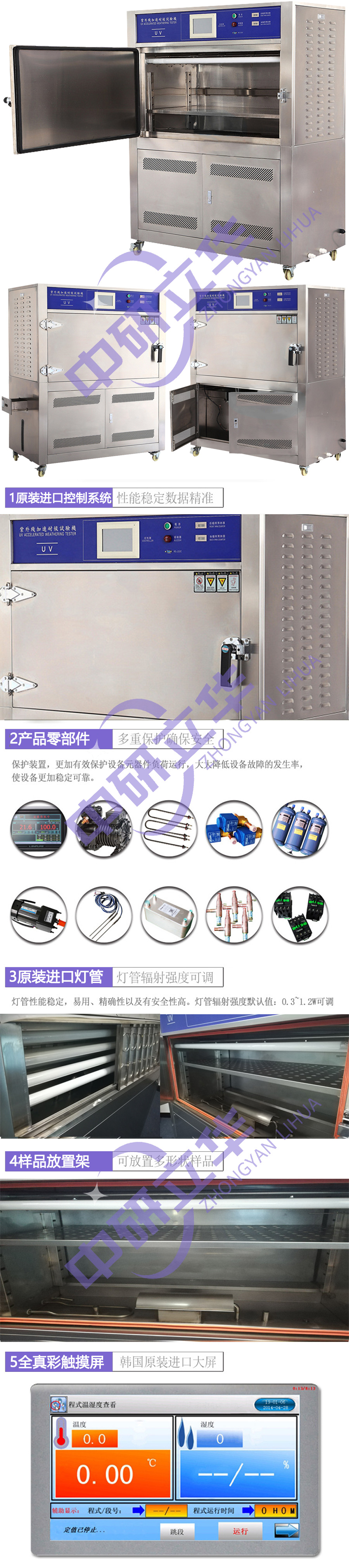 產(chǎn)品用途 QUV紫外耐候老化試驗(yàn)箱可以模擬由陽光、雨水和露水對(duì)材料造成的危害,UV利用熒光紫外燈模擬陽光照射的效果,利用冷凝濕氣雨水和露水。被測(cè)試材料放置于一定溫度下的光照和潮氣交替的循環(huán)程序中進(jìn)行測(cè)試。UV用數(shù)天或數(shù)周的測(cè)試,即可重現(xiàn)戶外數(shù)月至數(shù)年出現(xiàn)的危害。危害類型包括:褪色、變色、失光、粉化、裂痕、渾濁、泡化、脆化、強(qiáng)度衰退和氧化。 UV試驗(yàn)箱數(shù)據(jù)可以幫助您選擇新材料,改進(jìn)現(xiàn)有材料,以及評(píng)估變化如何影響產(chǎn)品的耐久性。在材料置于戶外的變化趨勢(shì)上,UV試驗(yàn)箱可以測(cè)出相關(guān)預(yù)測(cè)結(jié)果。